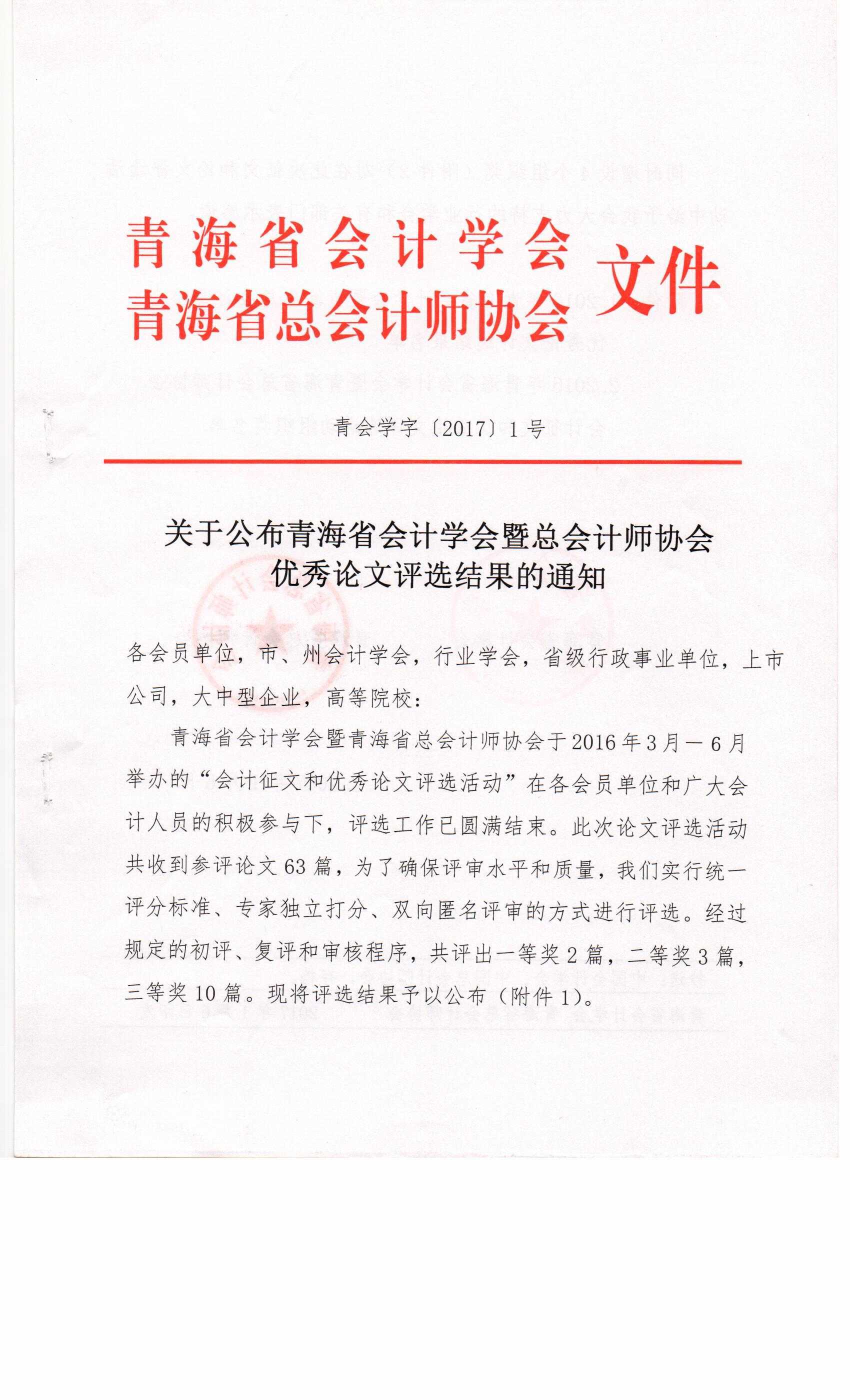 关于公布青海省会计学会暨总会计师协会优秀论文评选结果的通知